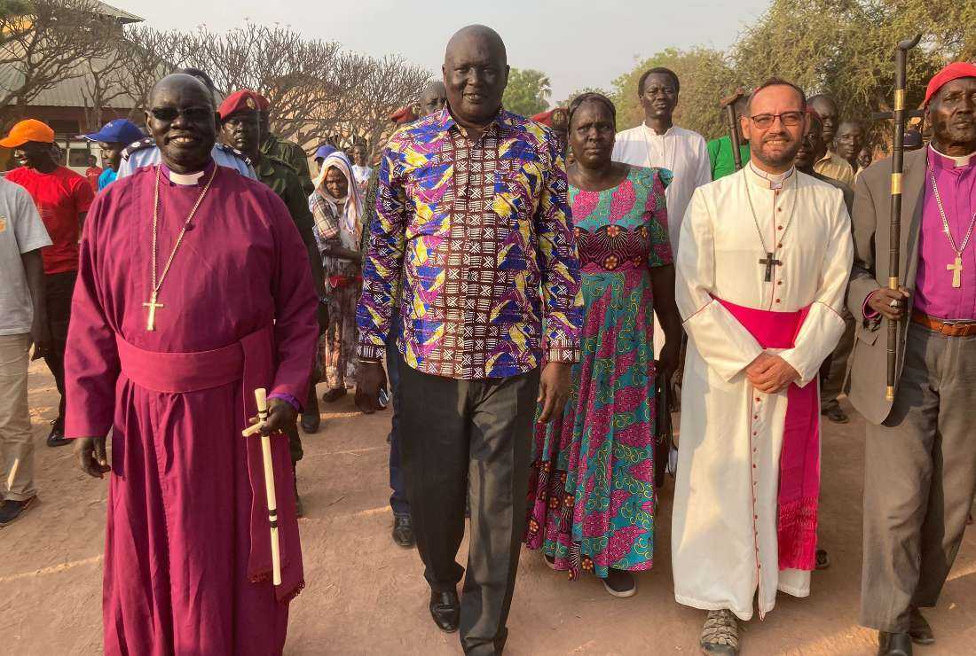 Catholic Bishop Christian Carlassare of Rumbek in central South Sudan, (right) is joined by Anglican Bishop Alapayo Manyang Kuctiel of Rumbek, (left) and Rin Tueny, the governor of Lakes State, (center) at the launch of his ‘Walking for Peace’ pilgrimage. (Photo: Sister Orla Treacy, Twitter)