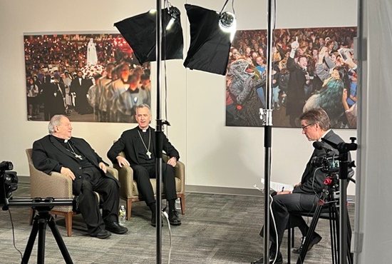 Archbishop Bernard Hebda and Bishop Joseph Williams talk Nov. 7 at the Archdiocesan Catholic Center in St. Paul with Joe Ruff, editor-in-chief of The Catholic Spirit, about Archbishop Hebda’s post-synodal pastoral letter, “You Will be My Witnesses: Gathered and Sent from the Upper Room.” MICHAEL PYTLESKI | THE CATHOLIC SPIRIT