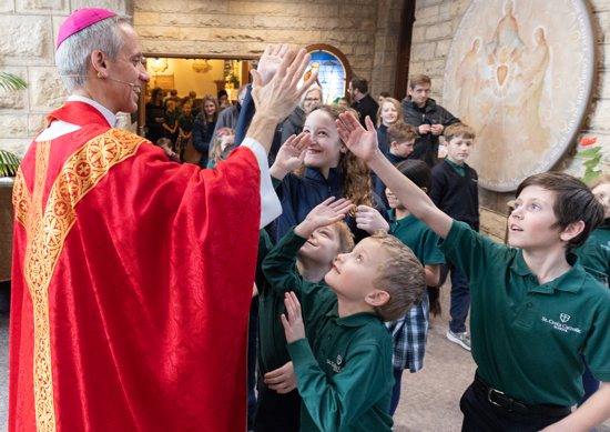 Bishop-elect Michael Izen gives high-fives to students of St. Croix Catholic School in Stillwater after a school Mass Jan. 5 at St. Michael church. DAVE HRBACEK | THE CATHOLIC SPIRIT
