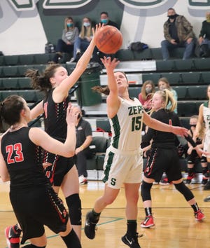 Shenandoah's Mackenzie Lynch (14) goes up for a shot over a  Rosecrans player during Saturday's Division IV sectional championship game in Sarahsville.