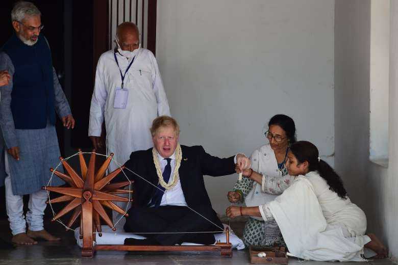 Johnson’s visit began with a trip to the Sabarmati Ashram, once the home of independence hero Mahatma Gandhi, where he was invited to sit cross-legged and work a wooden spinning wheel.