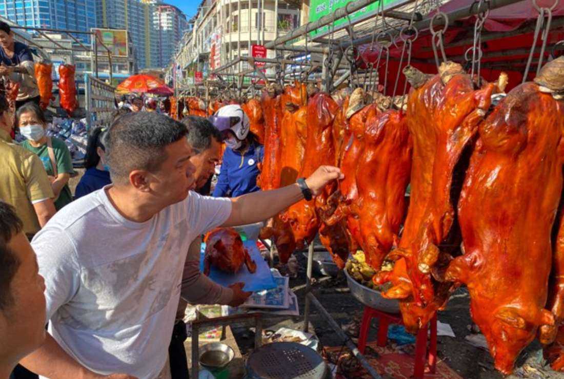 Customers look at roast pigs for sale at a market in preparation for the Lunar New Year celebrations in Phnom Penh on Jan. 21. (Photo: AFP)