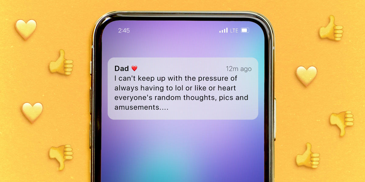 “For all future texts: I love them, laugh at them, or like them, unless it’s bad, then I dislike them. In perpetuity. I can’t live with this pressure. I’m out.”