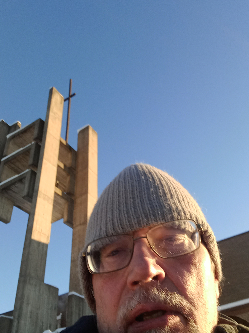 As I approached Immaculate Conception Parish, I saw a truck’s license plate that took a slap at such weather. Standing next to it, the bell tower towered over me when I snapped a selfie, and the camera almost froze up like my mustache.