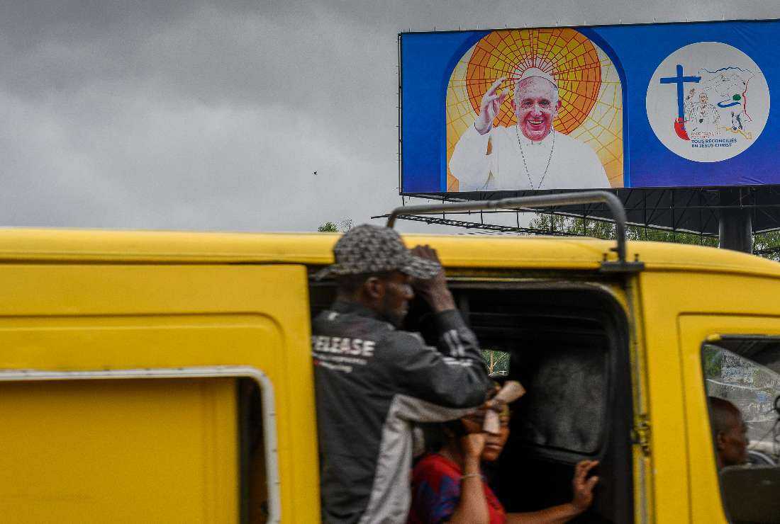 A billboard shows an image of Pope Francis as passengers travel on a minibus in Kinshasa on Jan. 22. (Photo: AFP)