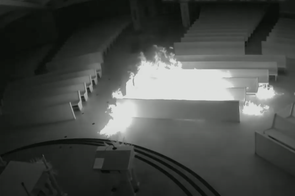 Surveillance video shows a man, allegedly Rodriguez-Colina, shirtless and wearing a surgical mask and white gloves, breaking into the church and pouring a jug of clear liquid on several of the wooden pews before setting them alight. He fled as the flames erupted, apparently without stealing anything.