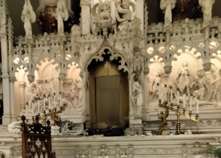 Some marble fixtures surrounding the tabernacle were shattered as the burglars tried to pull their target free of its anchors. The heads of two marble statues — both of them angels — were among the debris littering the floor.