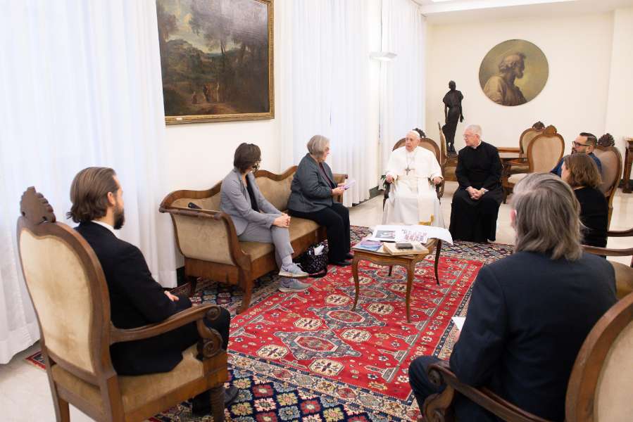 The six Rome-based employees of CNS met privately with Pope Francis at the apostolic palace on Feb. 1 to mark the news agency’s centenary.