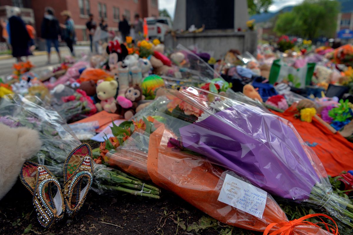 Moccasins and flowers are amongst the items left at a makeshift memorial on the grounds of the former Kamloops Indian Residential School, after the Tk’emlups te Secwepemc band council encouraged mourners to take part in a national day of prayer to honour the remains of 215 children that were found at the site in Kamloops, B.C., June 6, 2021.