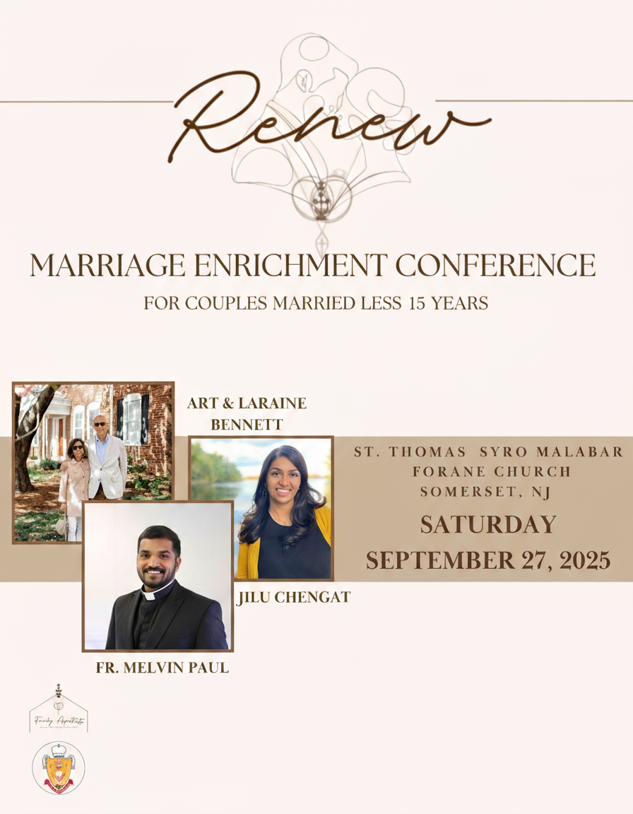 SOMERSET, NEW JERSEY: The Family Apostolate of the St. Thomas Syro Malabar Catholic Diocese of Chicago is pleased to announce a Marriage Enrichment Retreat on Saturday, September 27, 2025, at the St. Thomas Syro Malabar Catholic Forane Church in Somerset, NJ (508 Elizabeth Ave, Somerset, NJ 08873). This one-day event, designed to strengthen marital bonds, was announced by Parish Vicar Rev. Fr. Jonnykutty Pulissery.