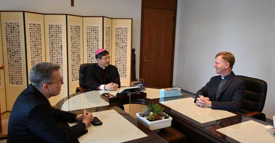 Lefébure, on his second visit to South Korea, was meeting Archbishop Peter Chung Soon-taick of Seoul at the archbishop’s house in Myeongdong.
