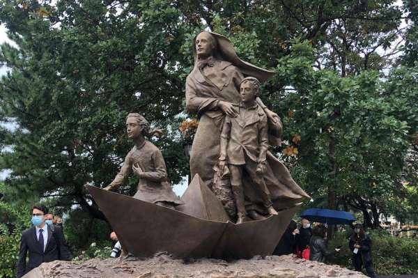 The new Mother Cabrini statue was unveiled Monday, Columbus Day, in lower Manhattan’s Battery Park City overlooking New York Harbor, Ellis Island and the Statue of Liberty. It shows Mother Cabrini, a young boy and a young girl in a paper boat sailing on water. The nun holds a book in her hand, while the boy holds a suitcase and a wind instrument invented in Italy.