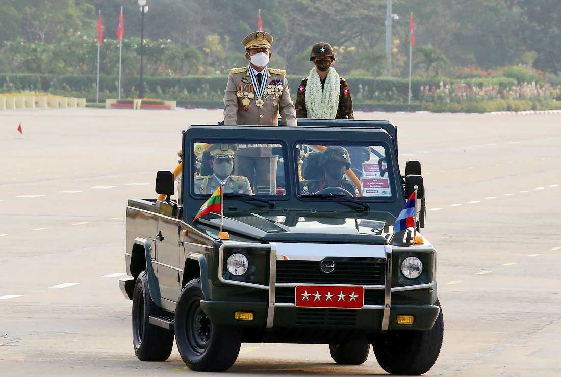 Myanmar’s Chief Senior General Min Aung Hlaing (left) attends a ceremony to mark the country’s 77th Armed Forces Day in Naypyidaw on March 27, 2022. (Photo by AFP)