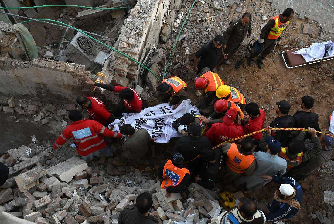 Rescue workers carry the remains of the blast victims from the debris of a damaged mosque after a blast inside the police headquarters in Peshawar on Jan. 30. (Photo: AFP)