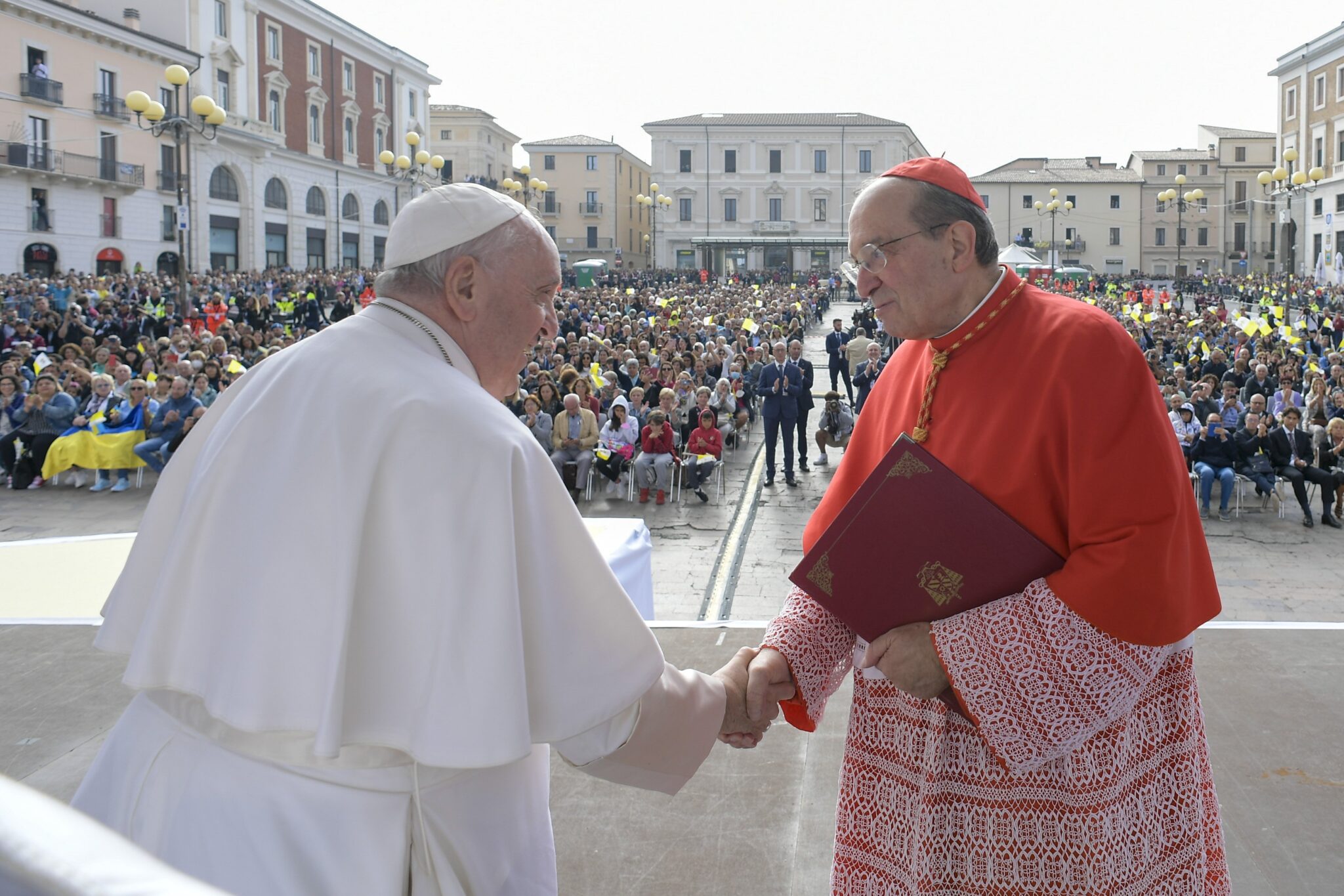Pope Francis greets Cardinal Giuseppe Petrocchi of L’Aquila during an encounter in Piazza Duomo in L’Aquila, Italy, Aug. 28, 2022. (CNS photo/Vatican Media)