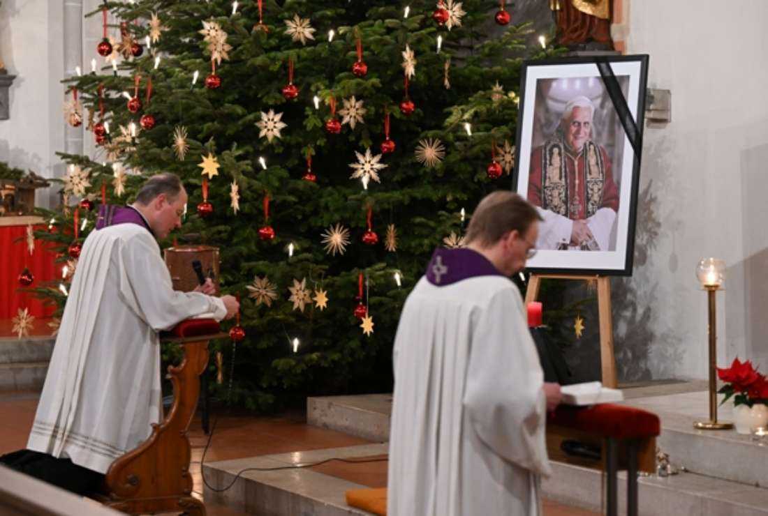 A photograph of late former Pope Emeritus Benedict XVI is seen during a Rosary prayer in the Catholic St Oswald church in his birth town Marktl am Inn, southern Germany, on Jan. 1, the day after his death at the age of 95. (Photo: AFP)
