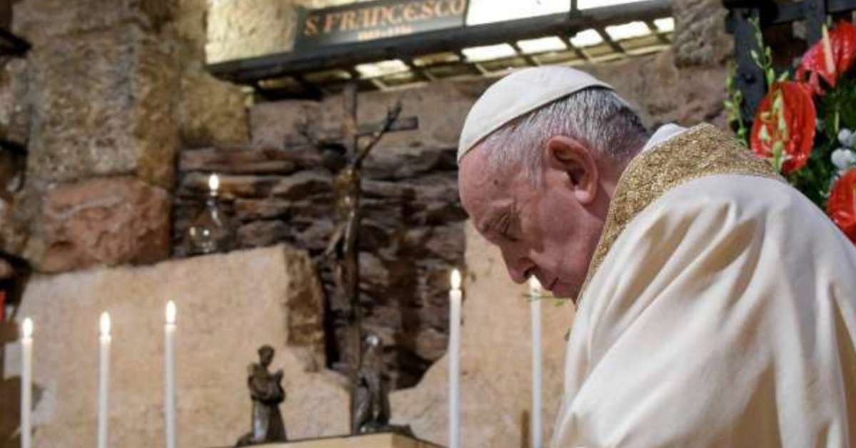 Pope Francis prays at the tomb of St. Francis of Assisi Oct. 3, 2020. Credit: Vatican Media.