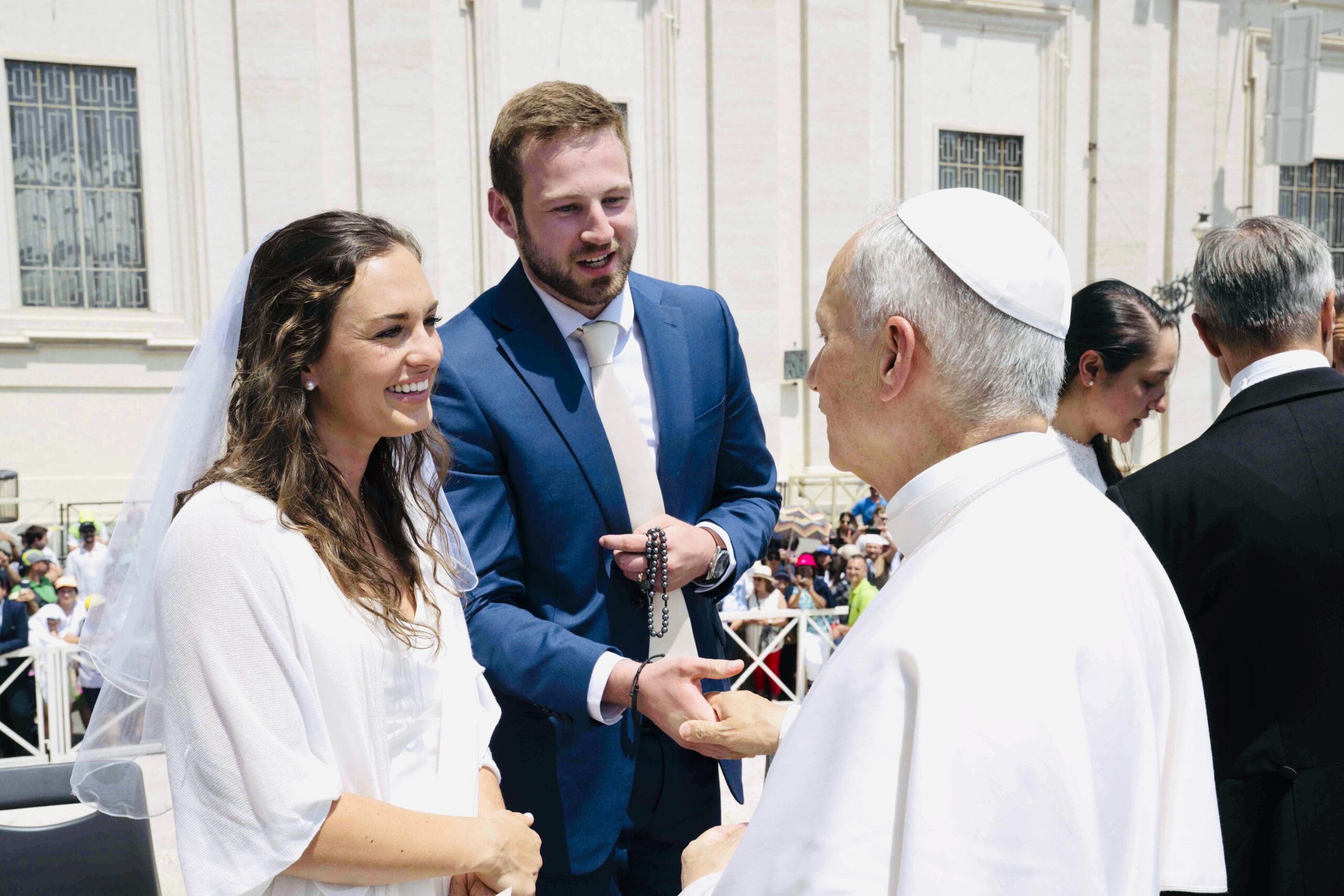 The Stevenses, who now live in Pensacola, Florida, approached the crowded general audience in their wedding attire unsure if they would even get the chance to meet the pope. They were one of about 65 newlywed couples in St. Peter’s Square that day to receive the pope’s “‘sposi novelli’ blessing,” an opportunity that the Vatican offers each week to Catholics within six months of their wedding.