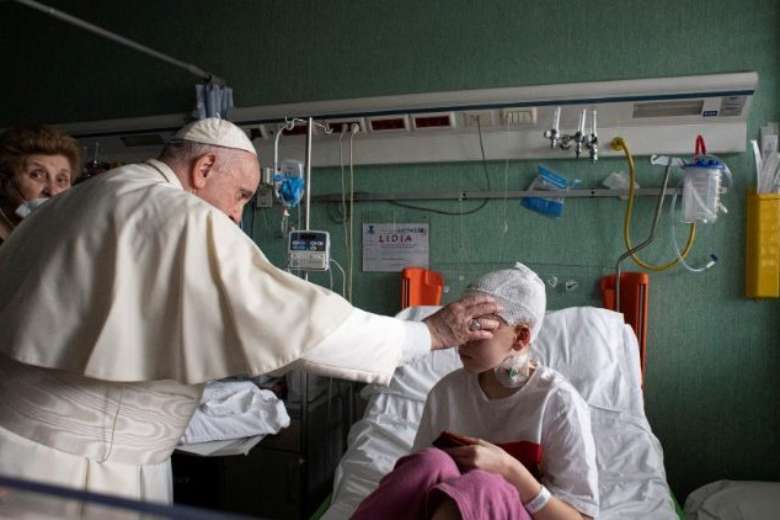 Pope Francis blesses a Ukrainian girl wounded in the war. (Photo: Vatican Media)