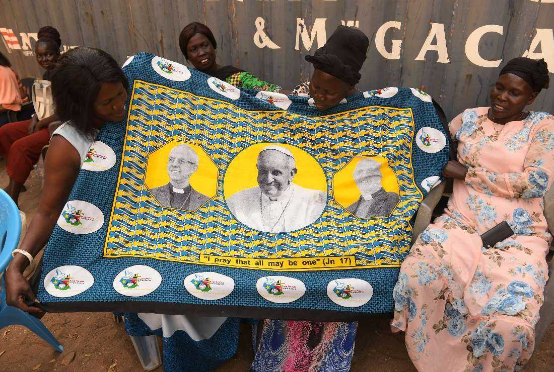South-Sudanese women hold a printed fabric showing the portrait of Pope Francis (center) as preparations continue ahead of his visit in Juba, on Jan. 30. (Photo: AFP)
