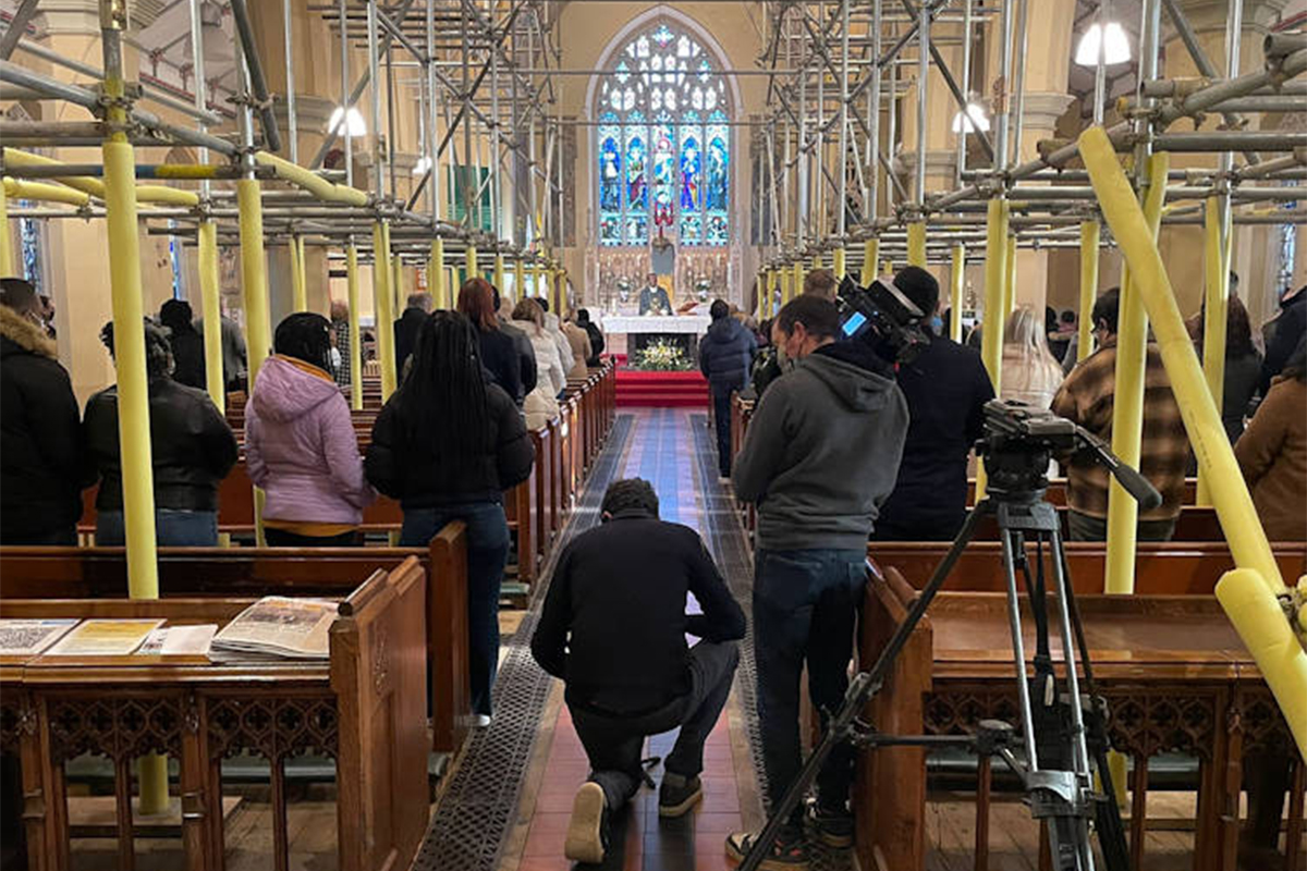 The team interviewed Fr Anthony Nwankwo, Brian Lafferty (Chair of the Parish Finance Committee), Suzi Pendlebury (Architect) and many parishioners, capturing inspiring footage of the large, multi-cultural congregation giving thanks amongst the scaffolding.