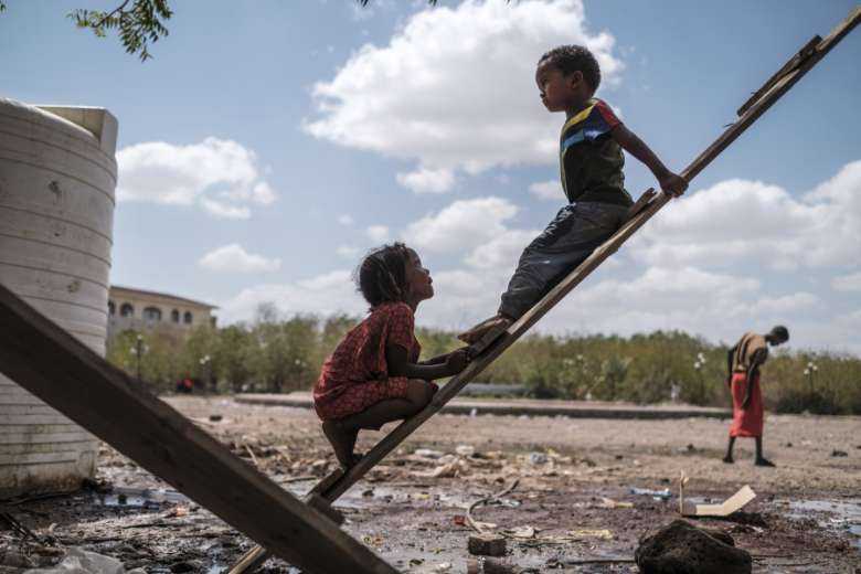 Children play among water tanks at the compound of the Agda Hotel in the city of Semera, Afar region, Ethiopia, on Feb. 14. (Photo: AFP)