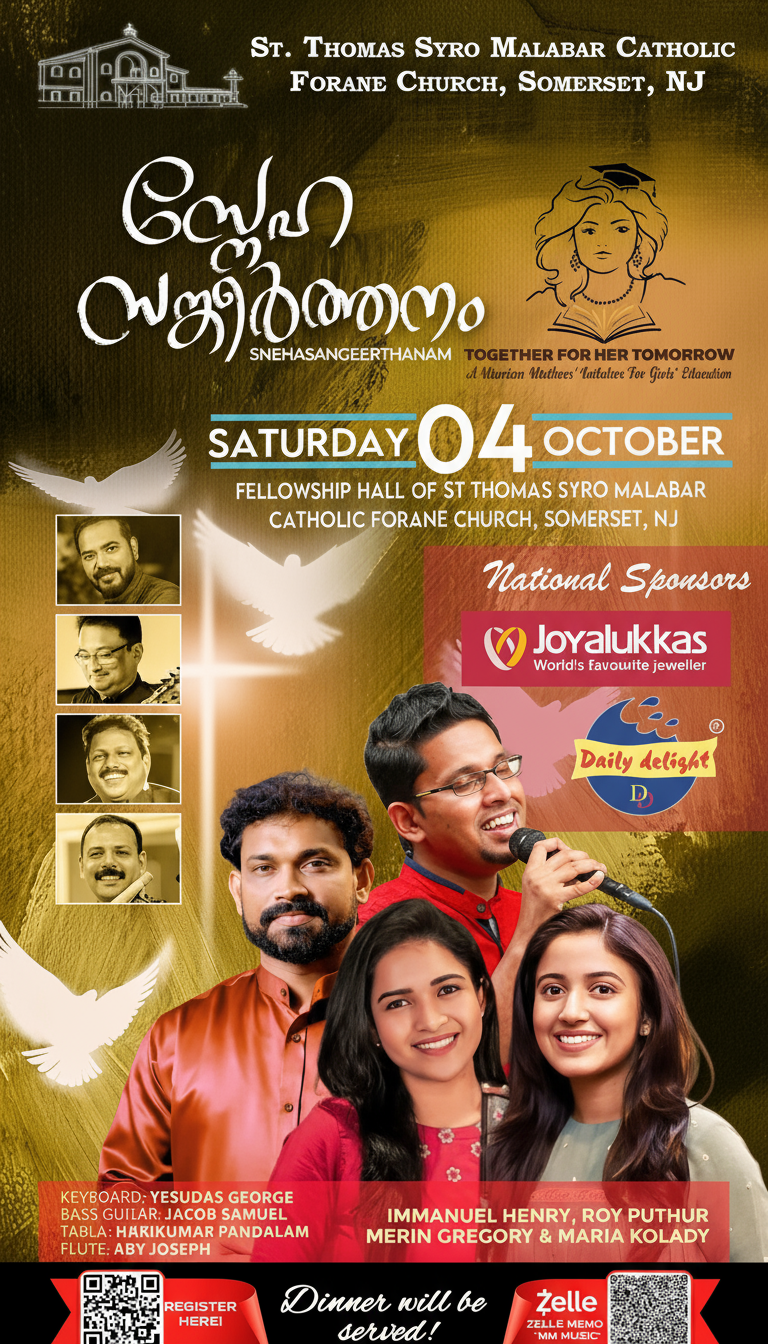 SOMERSET, NJ – A grand spiritual musical evening, “Snehasangeerthanam 2025,” will be held on Saturday, October 4, 2025, at the St. Thomas Syro Malabar Catholic Forane Church in Somerset, New Jersey. The event is a fundraiser for the noble initiative “Together for Her Tomorrow,” which aims to provide educational support to underprivileged girls in Kerala. The Marian Mothers and the St. Vincent De Paul Society jointly organize the program.