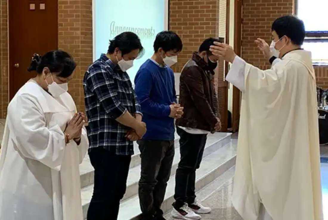 A Catholic priest blesses migrant Filipino Catholics on their birthday in a church in South Korea. (Photo courtesy of Moyse Cheonan)