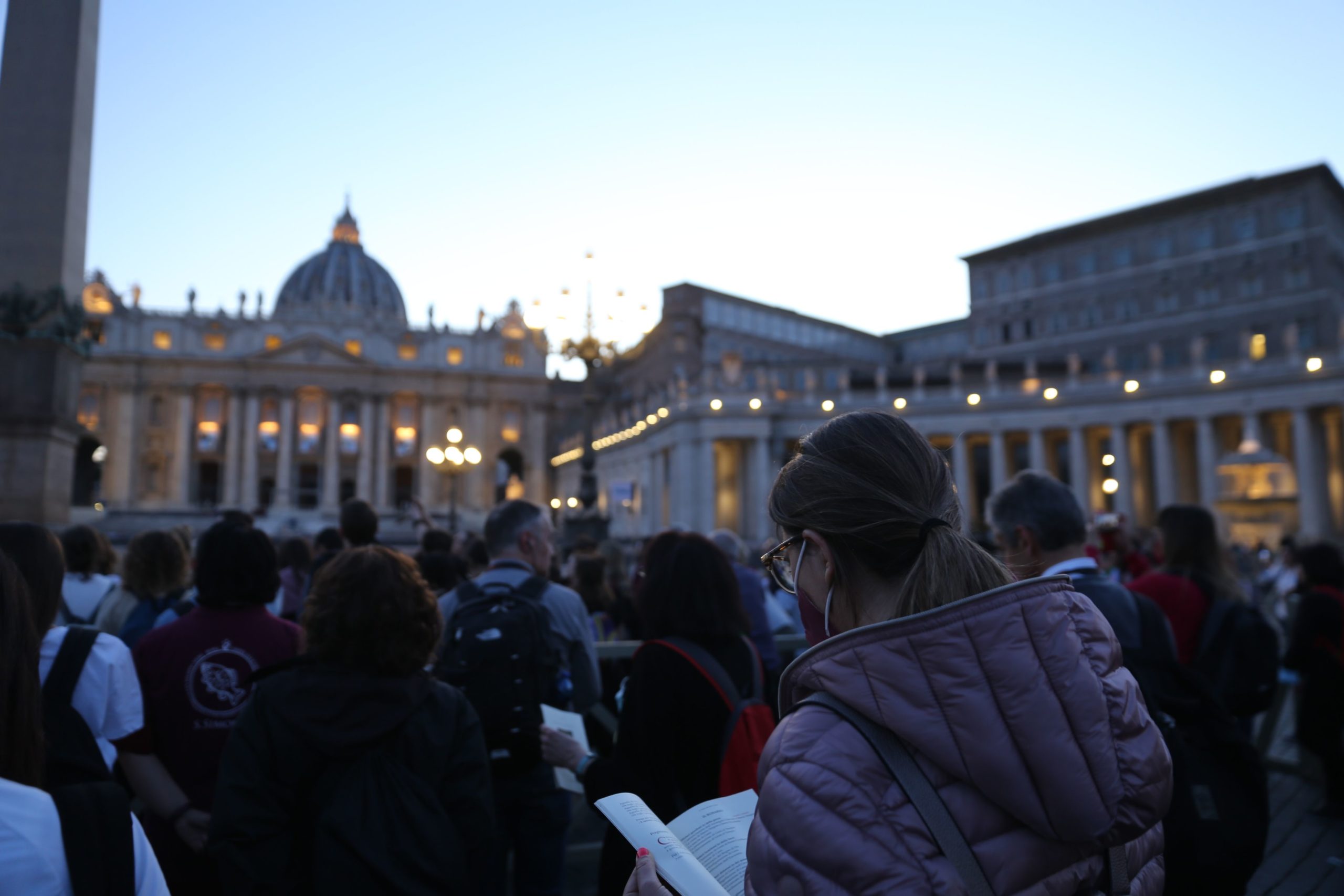 Pilgrims next arrived at the Domine Quo Vadis Church after a silent, moonlit walk through the ancient Appian Way Park, flanked by the silhouettes of Italian cypress trees.