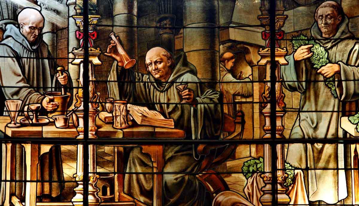 Stained glass depicting Benedictine monks, via Learnreligions.com