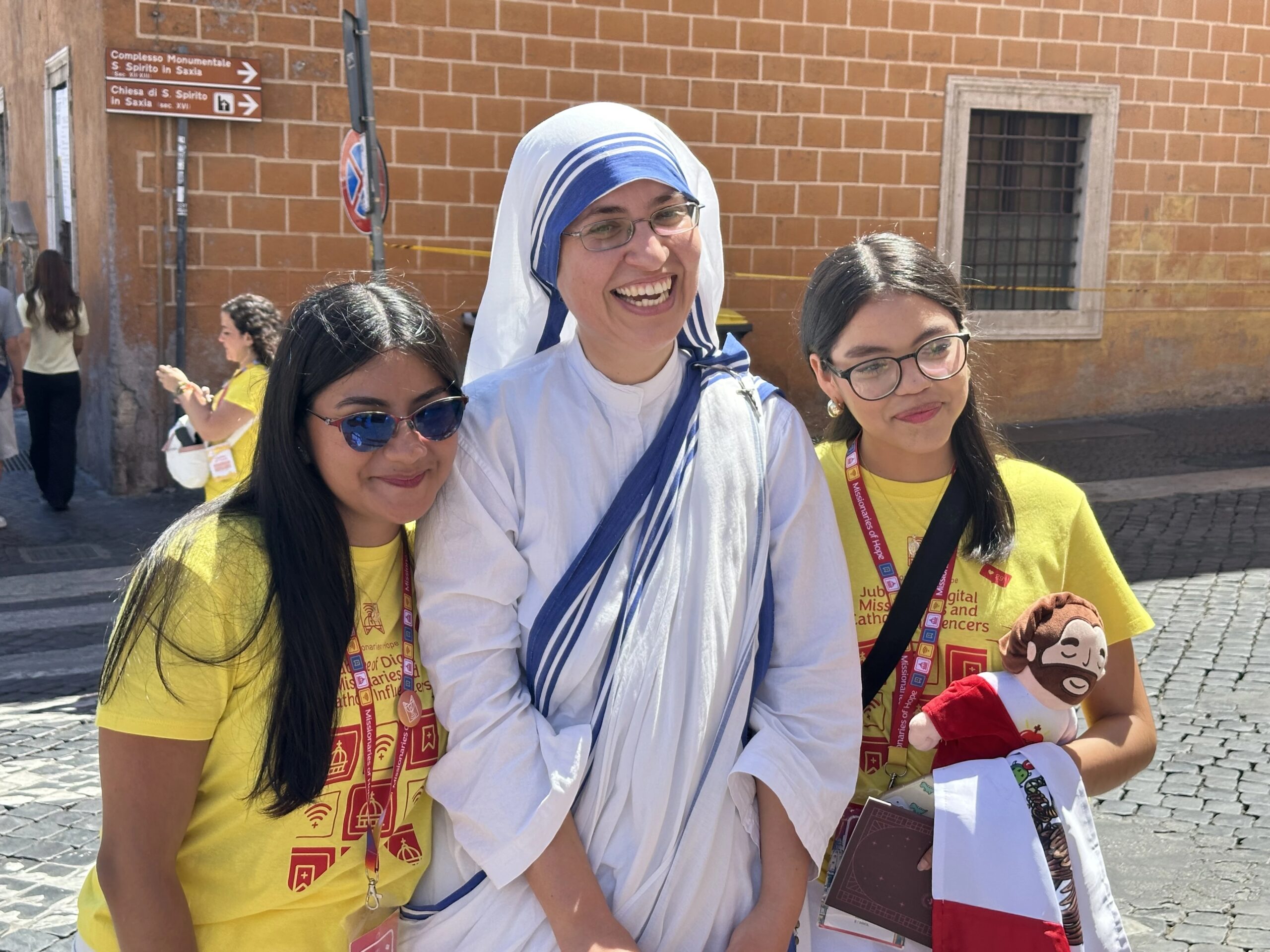 In their no-frills style, the sisters are also taking to the streets, approaching young people one by one along the Via della Conciliazione — the broad avenue leading to St. Peter’s Basilica — inviting them to spend time with Christ in all-day Eucharistic adoration and to learn about the mission and message of their founder, St. Teresa of Calcutta.
