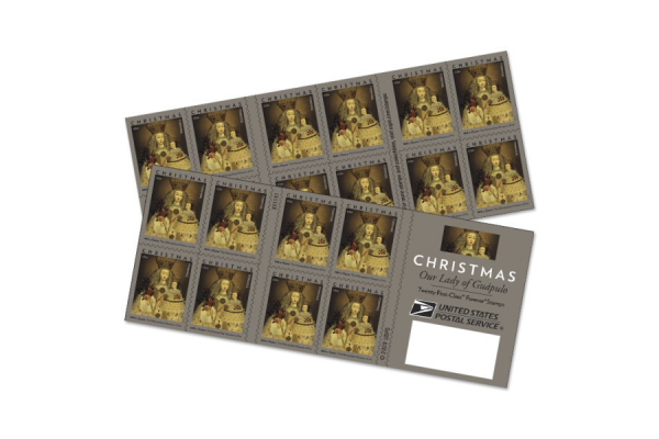 “Enrobed in a pyramidal gown speckled with jewels and holding a scepter woven with roses and leaves, a crowned Virgin Mary looks down at a similarly adorned Christ Child in her left arm. A red rosary ropes across the center of her dress and down to her right,” the USPS wrote in its description of the stamp.