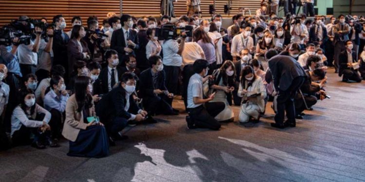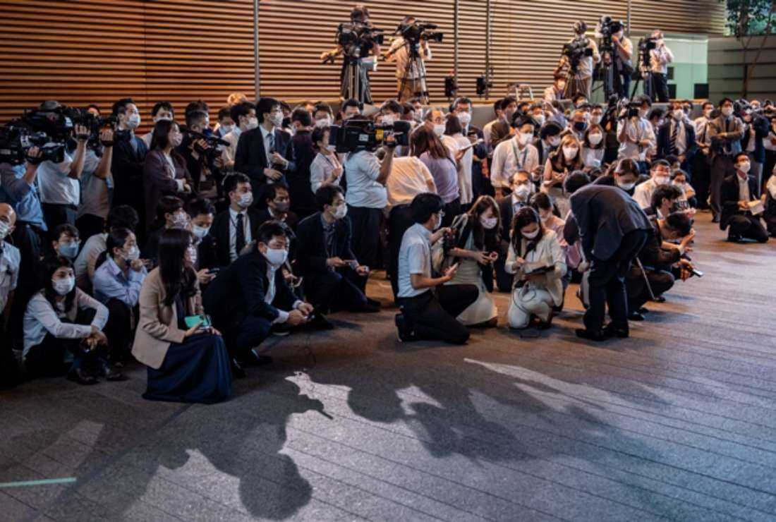 Journalists gather for a media huddle at the Japanese prime minister’s office in Tokyo on Oct. 4, 2021. (Photo: AFP)