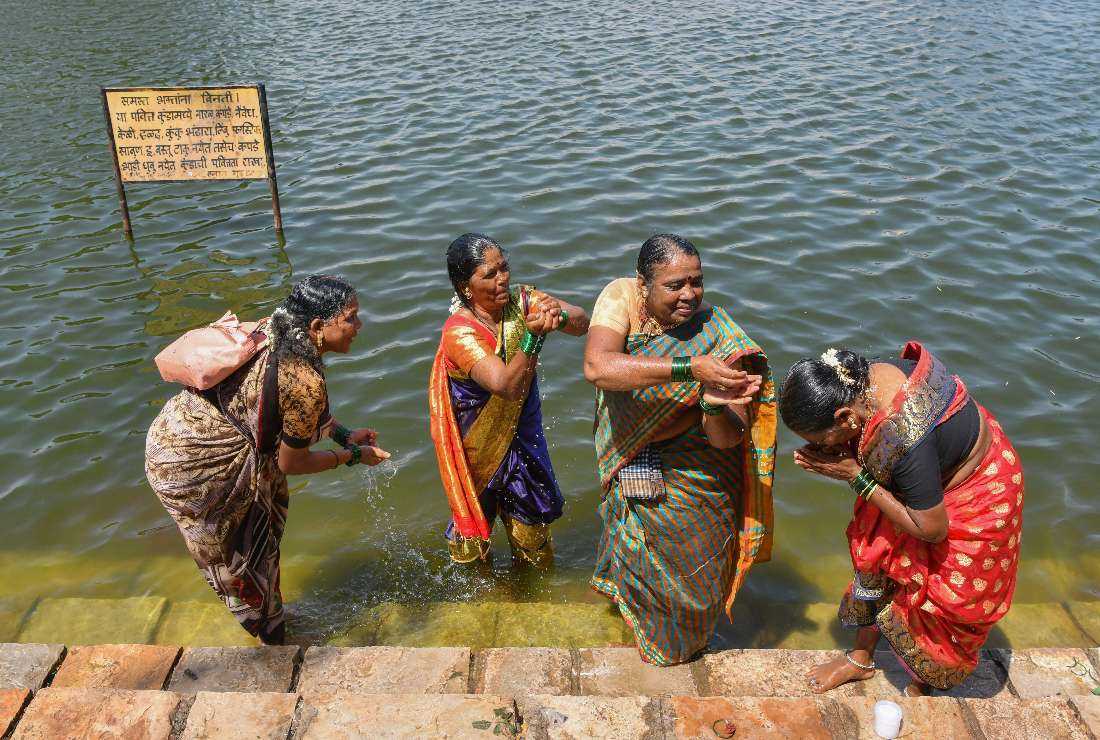 In this picture taken on Sept. 21, 2022, Huvakka Bhimappa (left) along with other former ‘devadasis’ women who were dedicated by their families to the Hindu Goddess Yellamma Devi, cleanse themselves in a pond before visiting Yellamma Devi temple in Savadatti of Belgaum district, in India’s Karnataka state. (Photo: AFP)